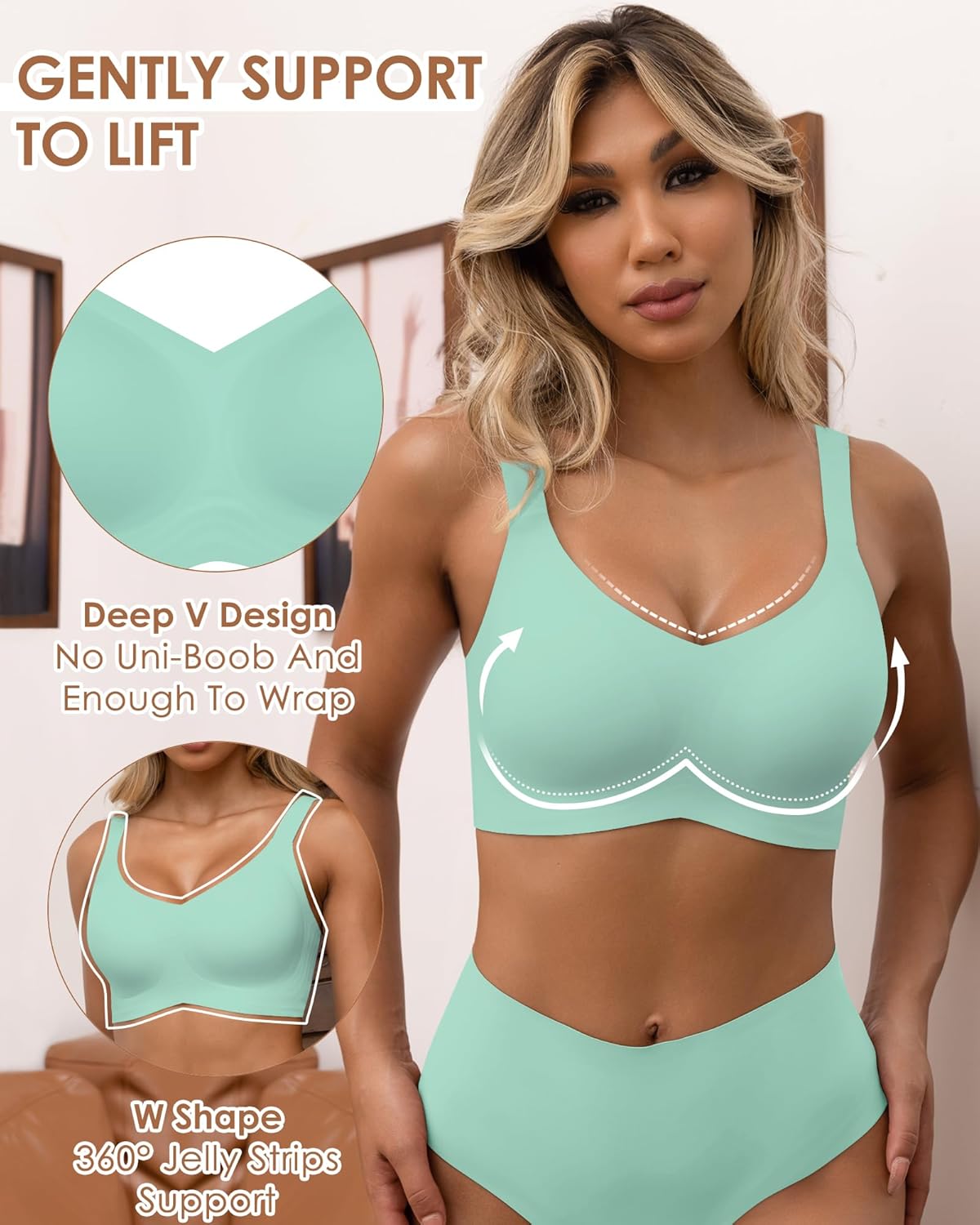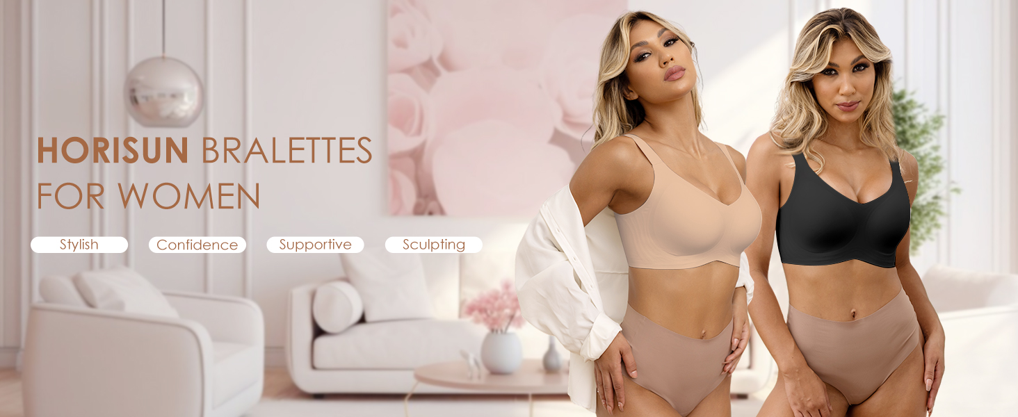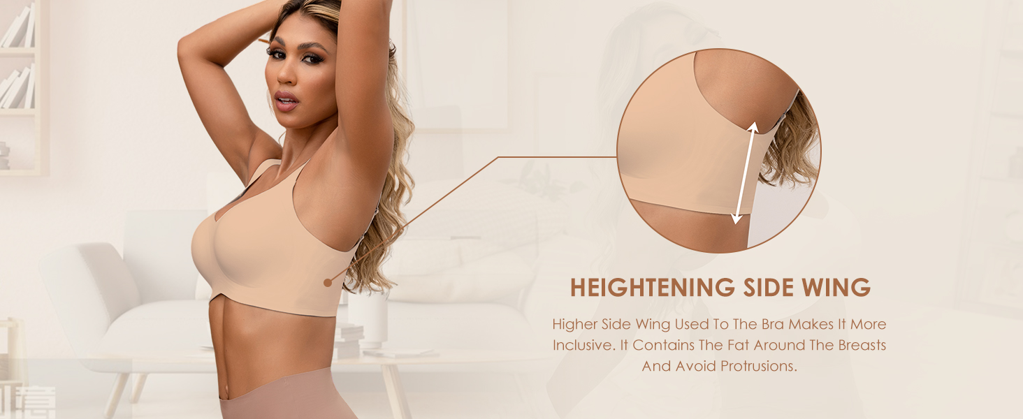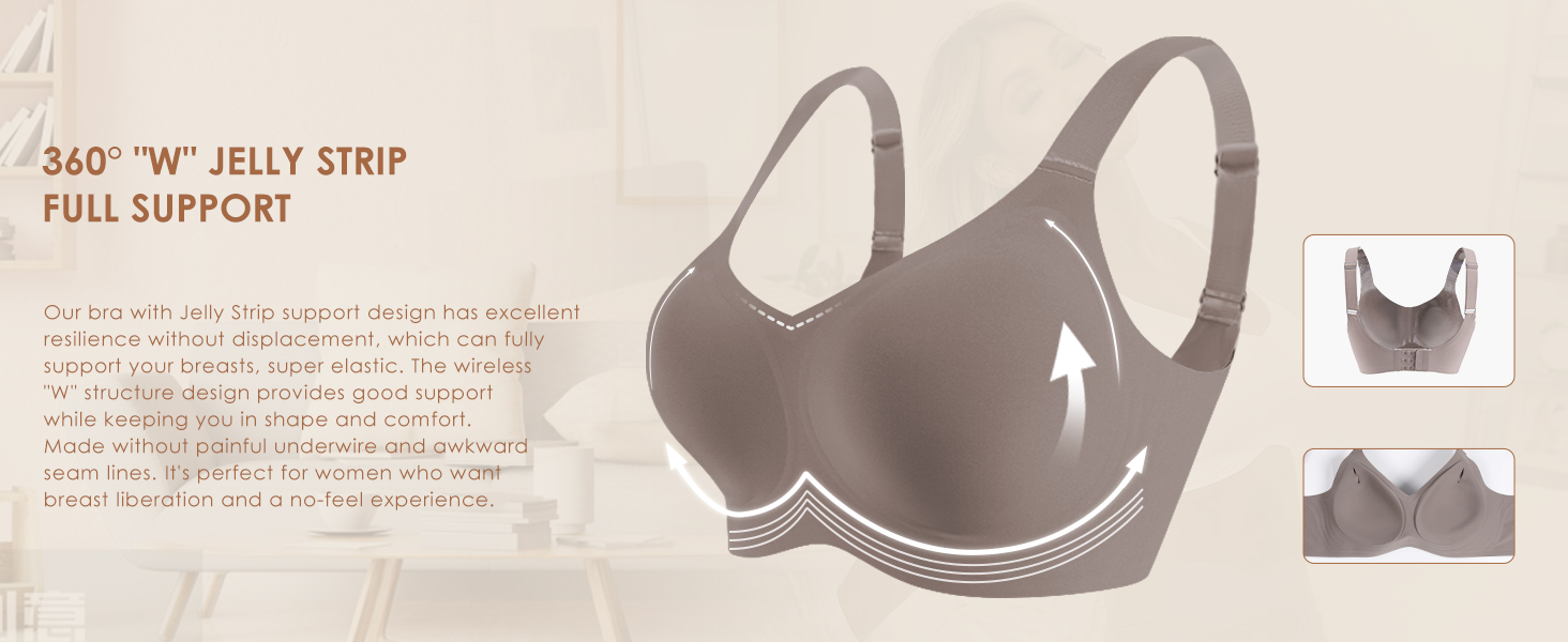 - 【”W” Jelly Strip Bonding Craft】Women’s Bralettes with 360° Support adopt the 3D support technology formed by jelly bars.The wireless “W” structure design can fully support your breasts and provides good support while keeping you in shape and comfortable. Full back coverage and wide side panels for smoothing and support to prevent no bulges on the sides or the back. The plus size wireless bra is designed to provide a natural lifting effect.